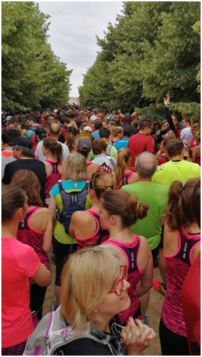 Au loin on voit les coureurs des autres sas partir. Nous avançons doucement, par vague et nous retrouvons Claire juste avant de nous élancer.